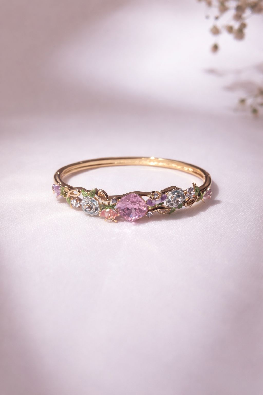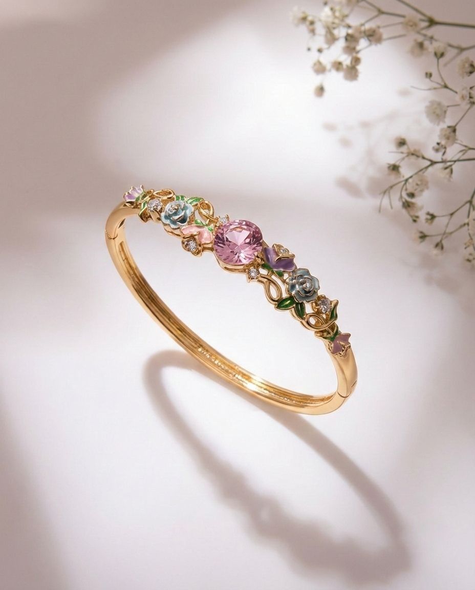Step into a hidden world of storybook romance.Discover the magic of a blooming forest at sunrise with the Aurora’s Garden bangle. Inspired by the beauty of an enchanted glade, this whimsical bracelet features a sweeping, gold-plated vine adorned with intricate, hand-painted enamel flowers. The delicate blossoms in soft shades of twilight purple, pastel blue, and blushing pink twine elegantly around the wrist.