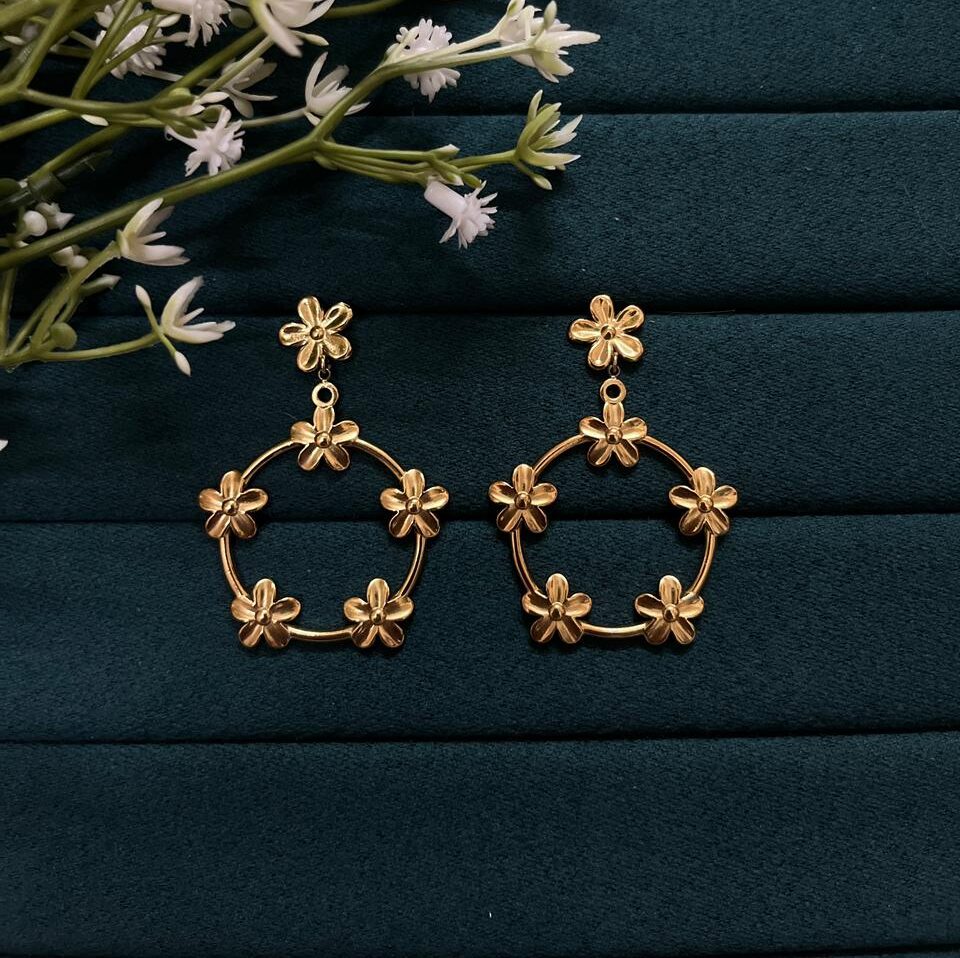 • Intricate Artistry: Each hoop is crafted with five interconnected golden blossoms, creating a unique ” flower wreath” silhouette.