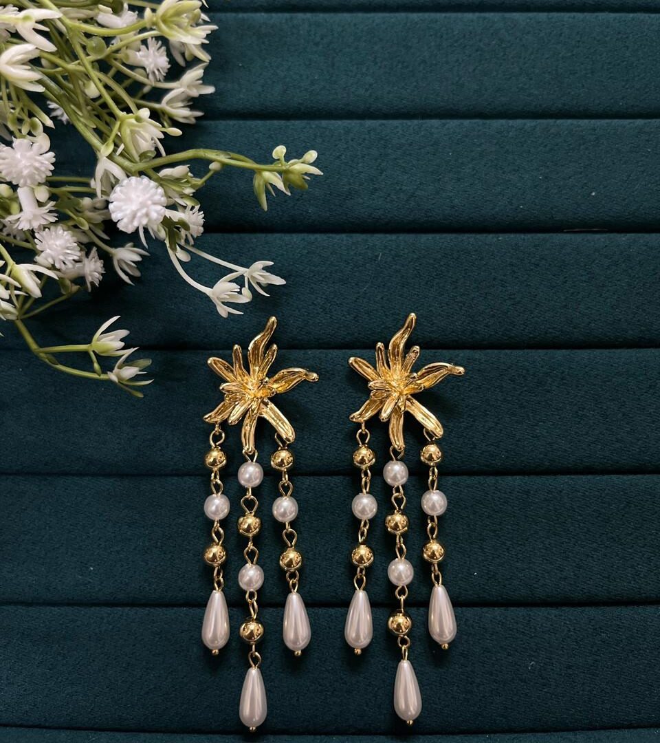 Designed for the woman who views every occasion as a grand stage, these dangles offer a dramatic, sweeping silhouette that dances with unparalleled grace. The interplay between the rugged, hand-tooled texture of the gold and the shimmering, fluid movement of the pearl strands creates a symphony of light and luxury. Whether you are walking down a wedding aisle, hosting an opulent garden gala, or simply commanding attention at a high-profile event, these earrings are your ultimate statement of botanical opulence and timeless romantic power.