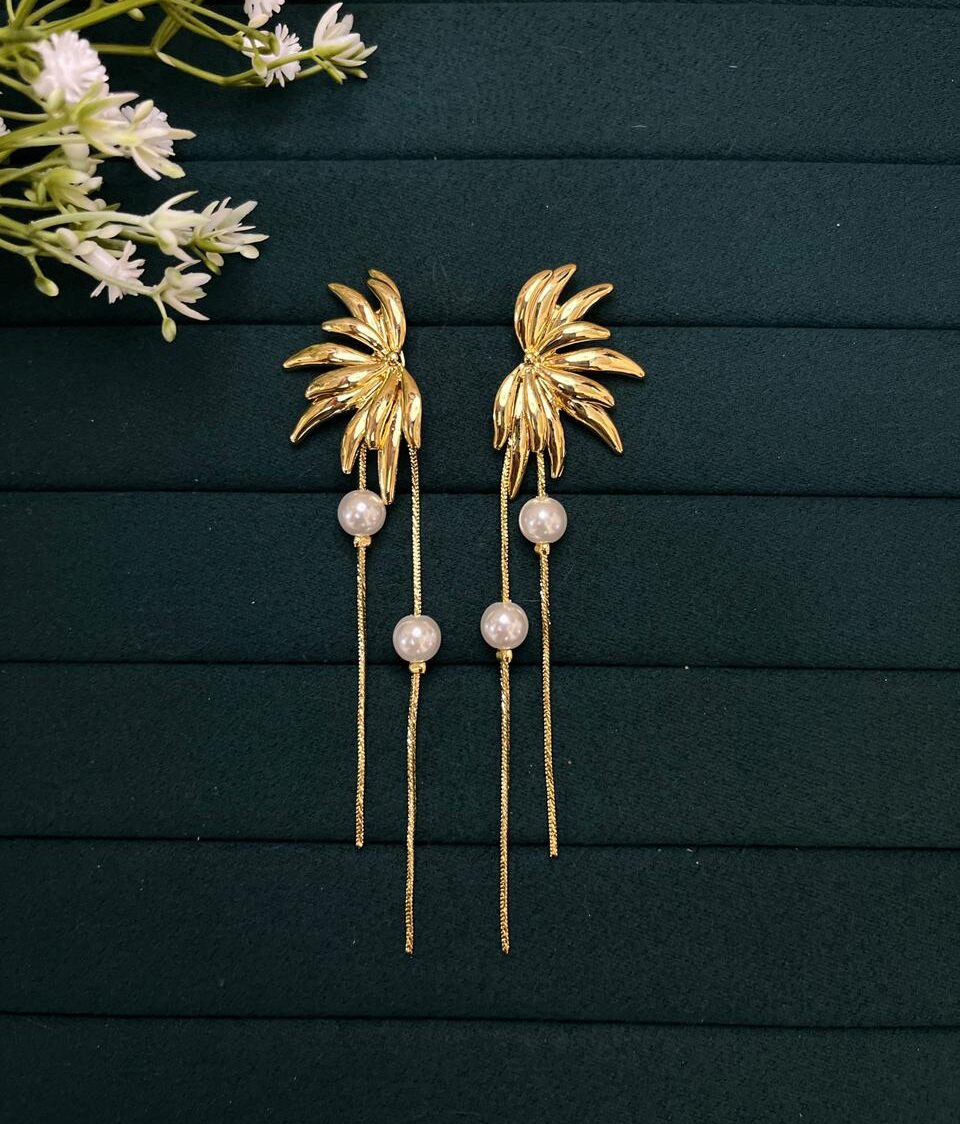 Tropical flair meets timeless sophistication. The Golden Palm & Pearl Drop Earrings feature a radiant, high-shine gold palm motif that securely anchors a glowing, natural freshwater pearl. Lightweight yet undeniably eye-catching, this striking silhouette beautifully frames the face. Whether you are dressing up a breezy linen sundress or adding a touch of vacation luxury to an evening gown, these drops are the ultimate resort-ready statement piece.