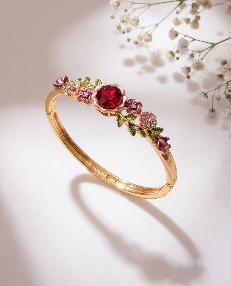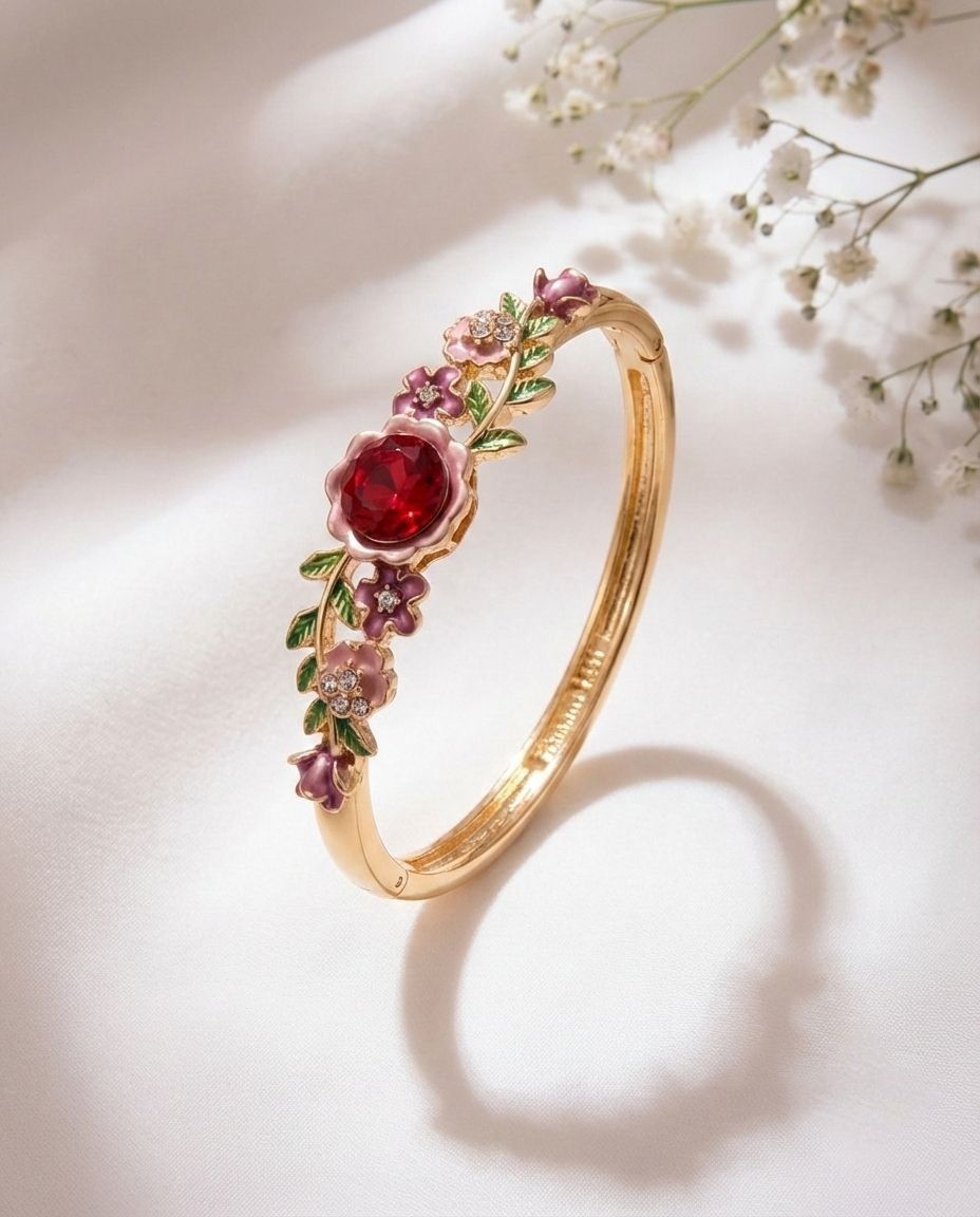Crimson Crystal Center & Gold-Plated Vine Design Step into a botanical daydream with the Rosé Reverie Bracelet. Indulge in the romantic charm of the Rosé Reverie, a masterfully crafted floral bangle designed for those who find beauty in the details. This exquisite piece features a high-shine gold-plated vine that delicately wraps around the wrist, blooming with intricate hand-painted enamel flowers in soft shades of rose and plum.