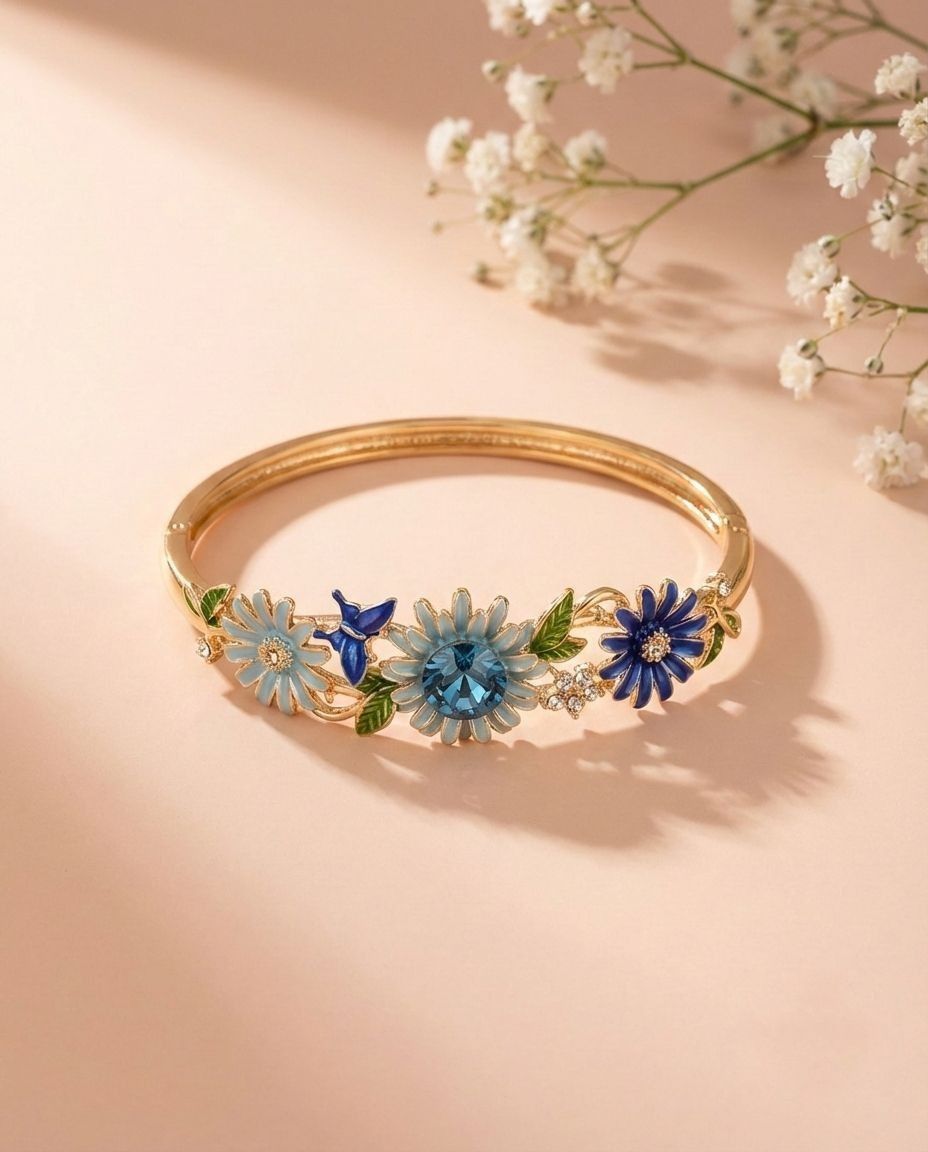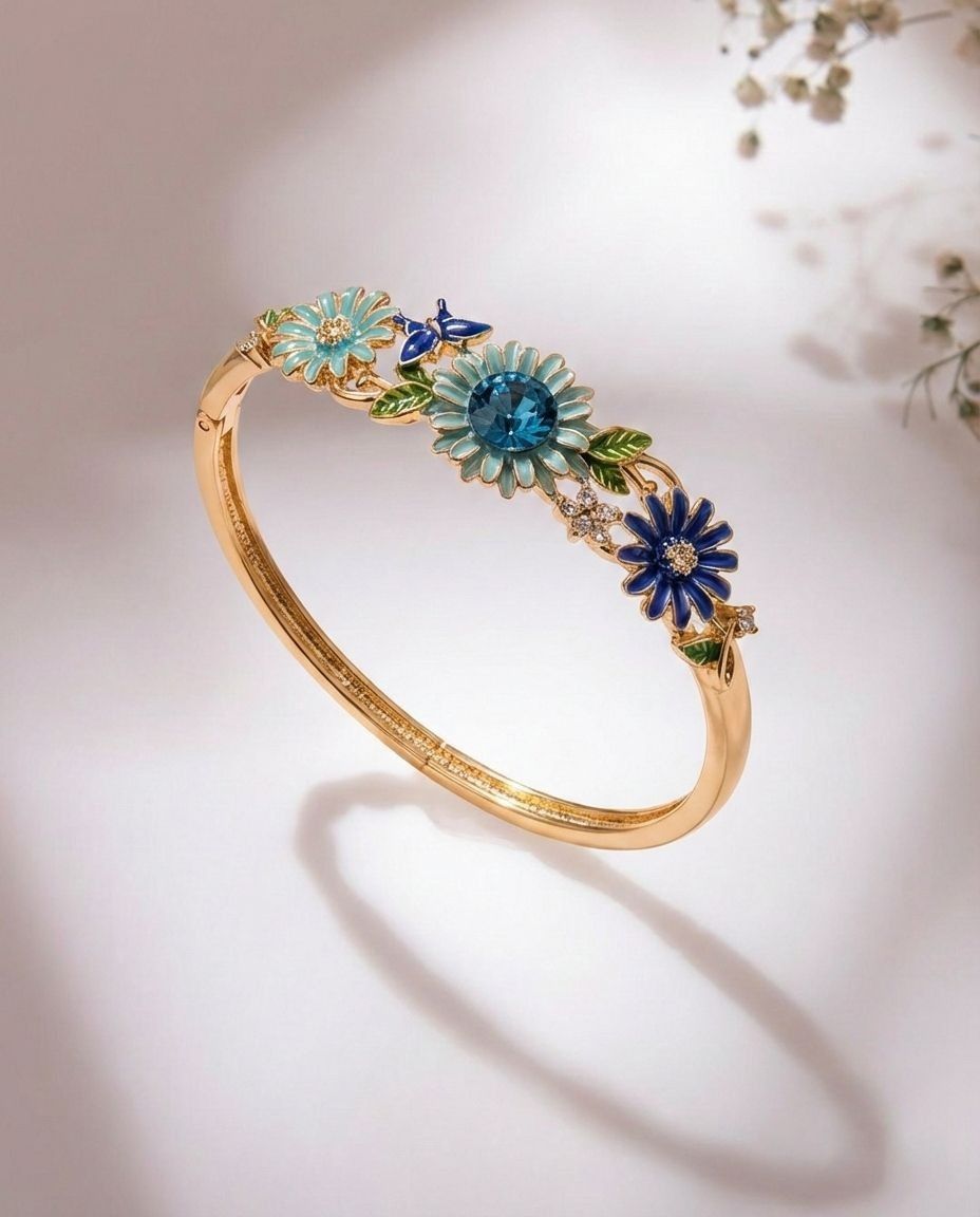 A breathtaking masterpiece that captures the very soul of a secret, sun-drenched sanctuary. This isn’t just jewelry; it is a botanical revolution forged in radiant gold. Adorned with a trio of hyper-pigmented, hand-enameled blooms, this bangle pulses with the deep mystery of royal blue and the crystalline clarity of a summer sky.